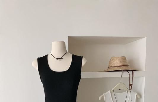 Dress Neck Mini Plain Scoop Ribbed Sleeveless A-Line