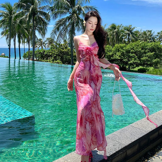 Midi Trim Tie Strap Sundress Accent Ruffle Dye Flower Spaghetti A-Line