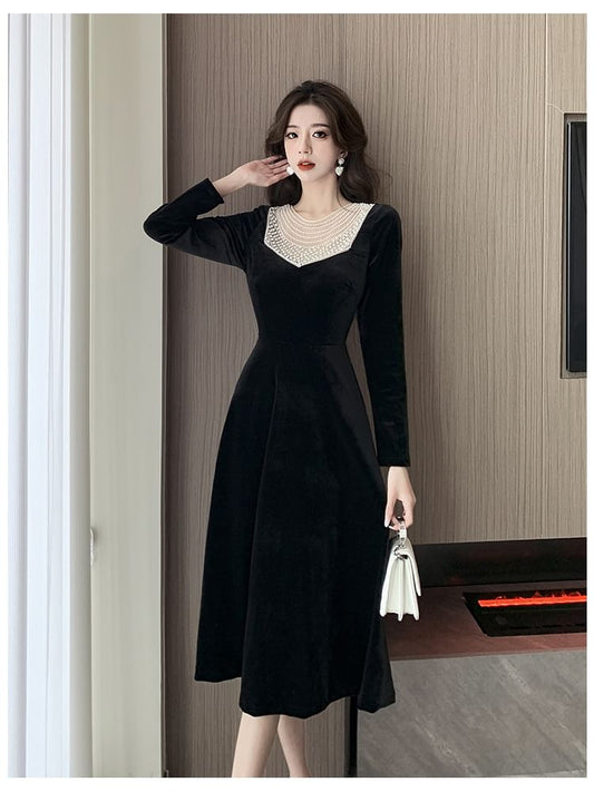 Long-Sleeve Crew Neck Plain Faux Pearl Accent Velvet Midi A-Line Dress