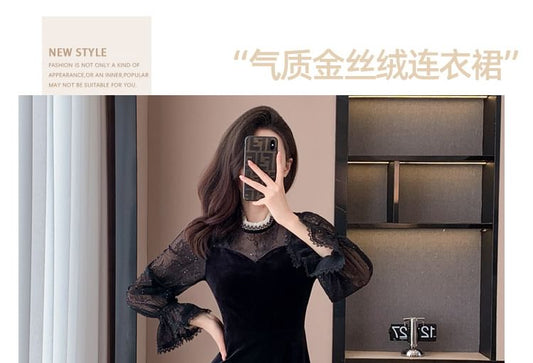 Long-Sleeve Crew Neck Lace Trim Velvet Midi A-Line Dress