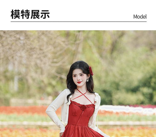 Spaghetti Strap Floral Print Midi A-Line Dress / Plain Tie Front Cardigan / Set