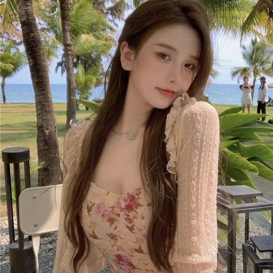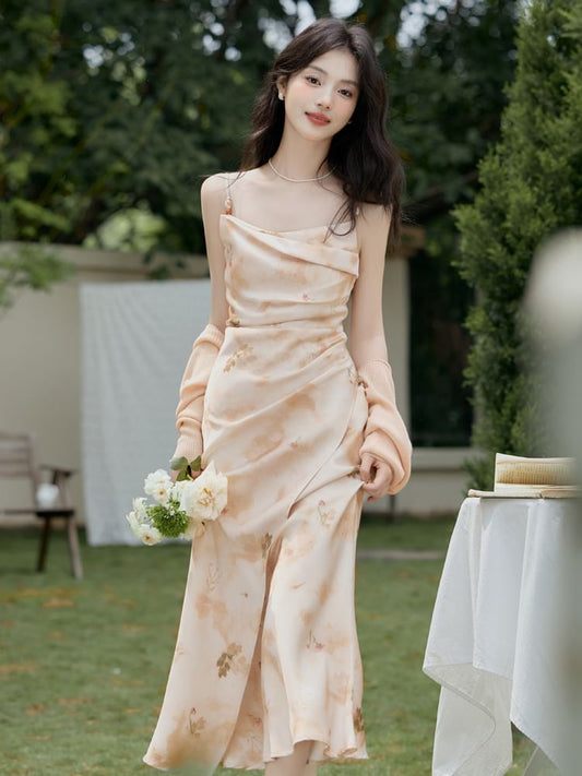 Plain Cardigan / Spaghetti Strap Floral Midi Sundress