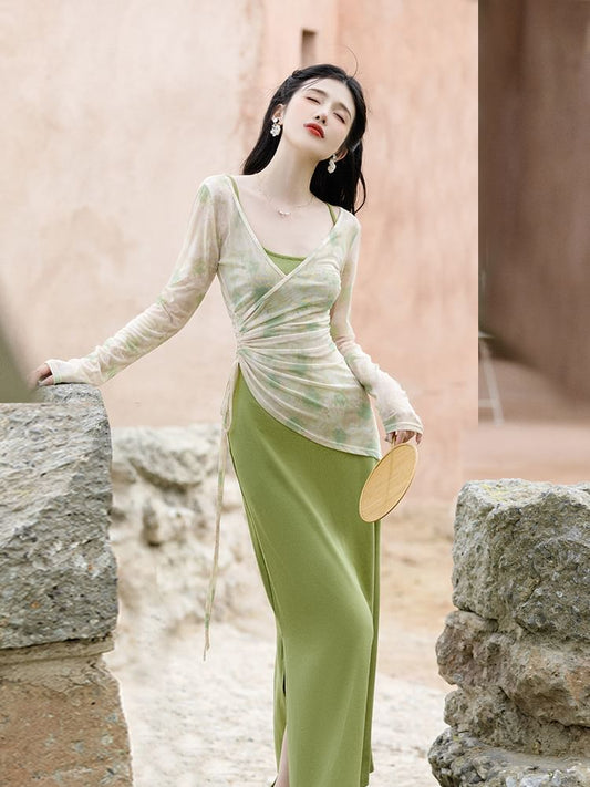 Set: Print Sheer Jacket + Spaghetti Strap Maxi Sheath Dress