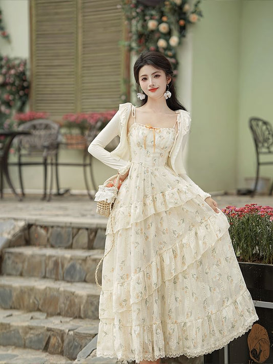 Spaghetti Strap Print Midi Tiered Dress / Plain Cardigan / Set