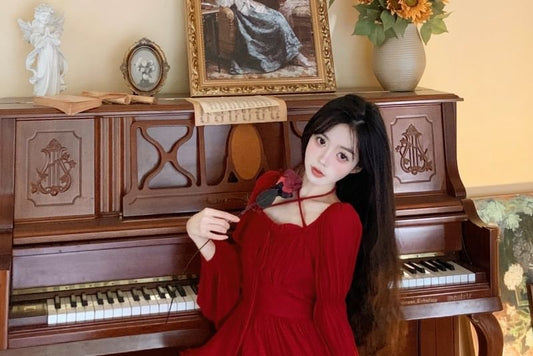 Long Sleeve Square Neck Frill Mock Two Piece Velvet Midi A-Line Dress