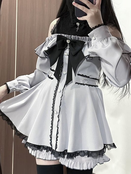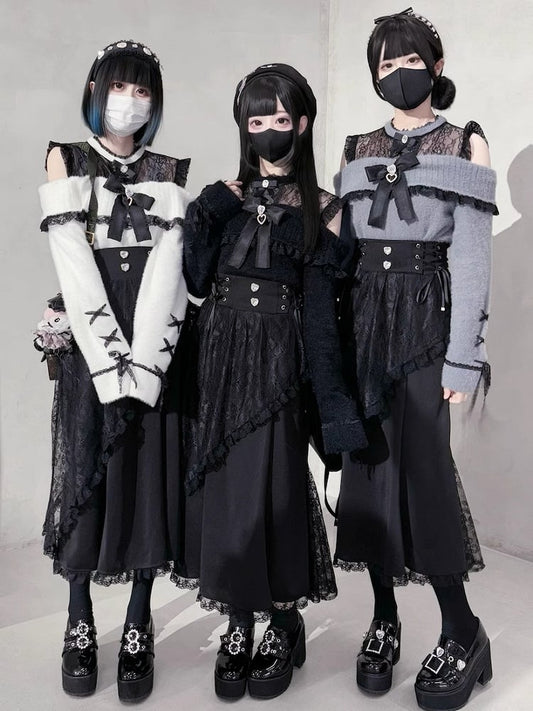 Jirai Kei Grey and Black Illusion Cutout Shoulder Landmine Sweater
