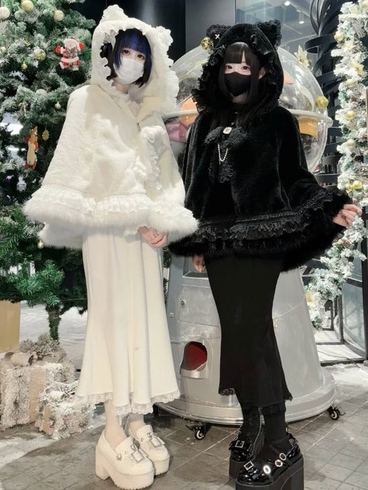 Cat Ears Design Plush Hooded Cape Plush Trim