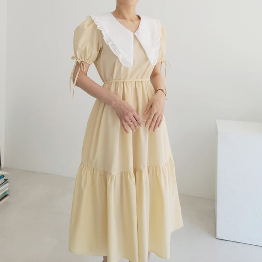 Short-Sleeve Contrast Collar Frill Trim Midi A-Line Dress
