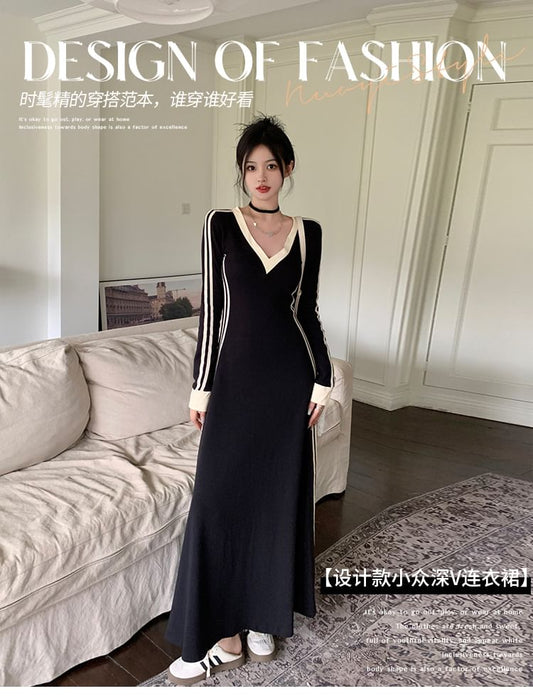 Long-Sleeve V-Neck Striped Maxi A-Line Dress
