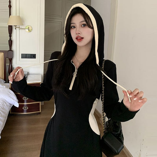 Long-Sleeve Hooded Plain Contrast Trim Midi A-Line Dress