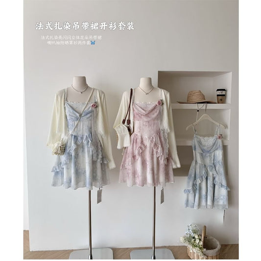 (Various Spaghetti Front Designs) Strap Lace A-Line Floral Dress Open V-Neck Set: Plain + Trim Print Cardigan