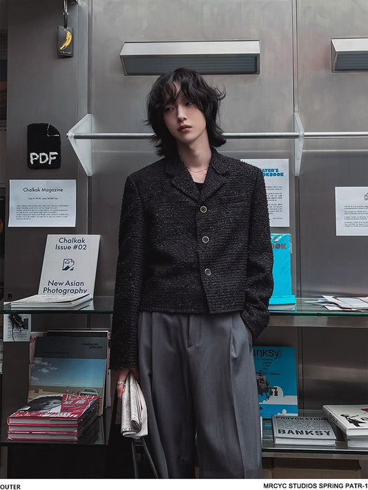 Notch Lapel Button-Up Plain Tweed Crop Jacket