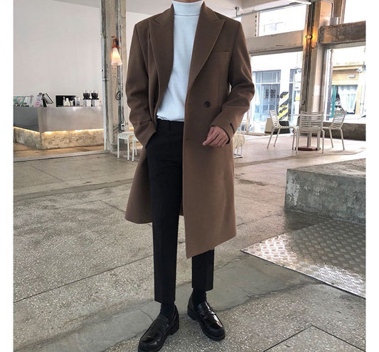 Long-Sleeve Plain Double-Breasted Woolen Coat