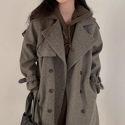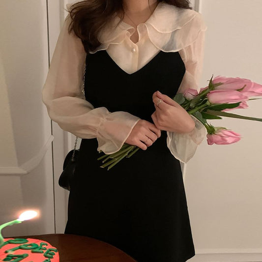 Long-Sleeve Collared Blouse / V-Neck Plain Mini A-Line Dress