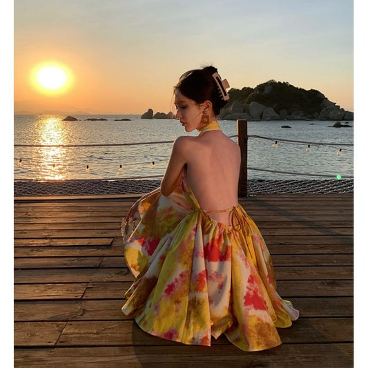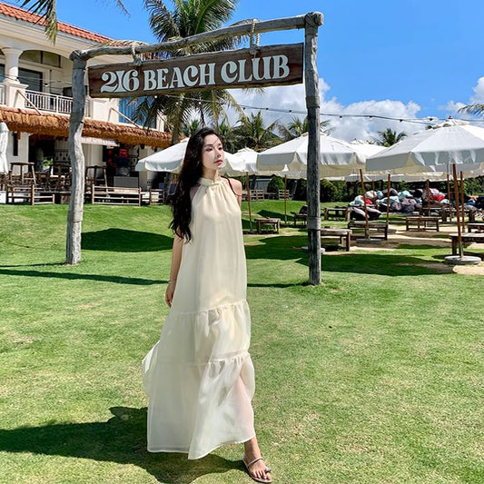 Halter-Neck Plain Midi A-Line Tiered Dress