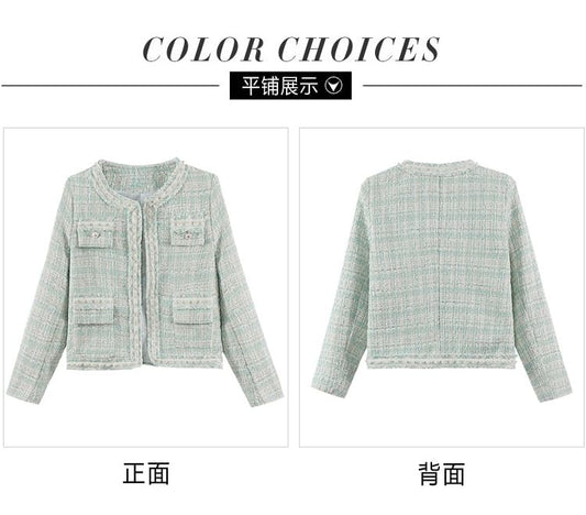 Crew Neck Plain Frayed Open Front Tweed Jacket