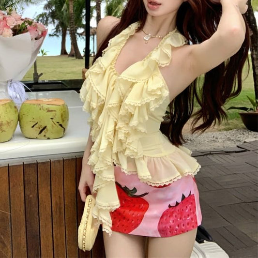 Plain Halter Strawberry Print Mini Ruffle Pencil Skirt High / Top Waist