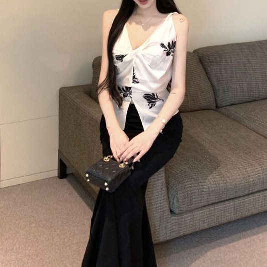 Floral High Plain Cami V-Neck Rise Slit Top Skirt Maxi Pencil / Print