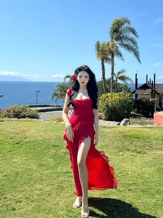 Open Back Plain Top Halter Set: Asymmetrical Layered Ruffle A-Line Skirt Rise + High V-Neck