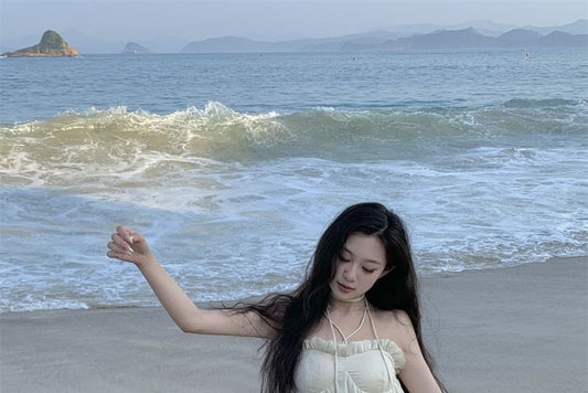 Set: Plain Asymmetrical Mesh Panel Bow Accent Ruffle Trim Open Back Camisole Top + High Waist Maxi A