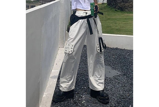 High Waist Lettering Embroidered Loose-Fit Wide-Leg Cargo Pants