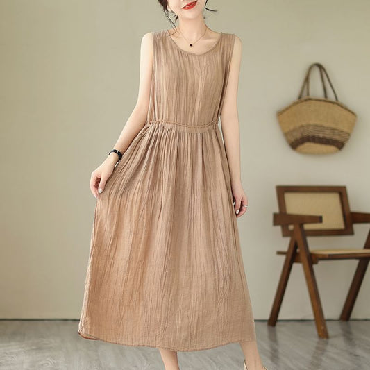 Sleeveless Round Neck Plain Drawstring Waist Maxi A-Line Dress