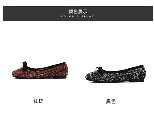 Faux Pearl Bow Tweed Flats