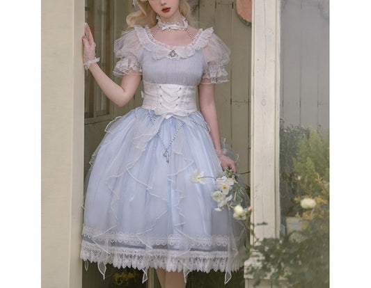 Square Neck Butterfly Print Bow Ruffle A-Line Lolita Dress / Lace Socks / Crinoline (Various Designs)