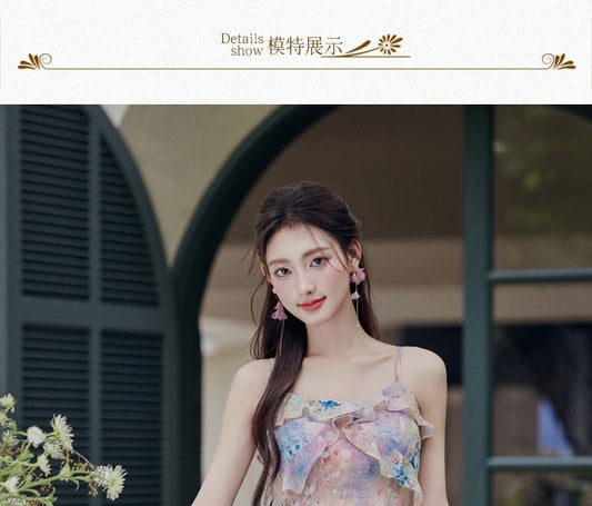 Plain Cardigan / Spaghetti Strap Floral Ruffle Midi A-Line Dress / Set