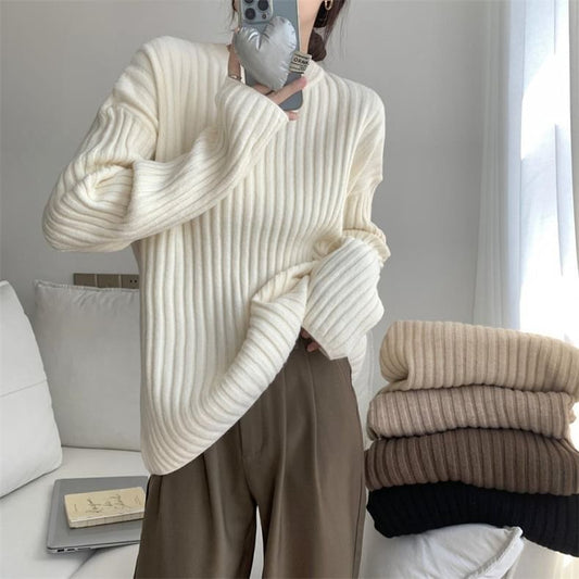 Knit Plain Long-Sleeve Cable Sweater Crew Neck