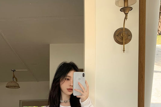 Long-Sleeve V-Neck Plain T-Shirt / Mid Rise Plain Mini A-Line Skirt