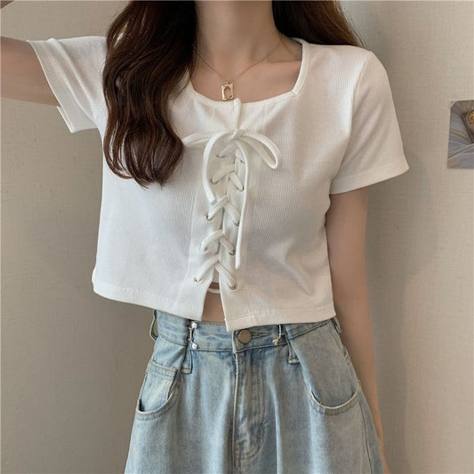 Top Embroidered V-Neck Button Short-Sleeve Panel