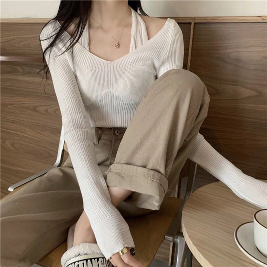Two-Piece Knit Neck Long-Sleeve Ribbed Plain Mock Slim Top Fit Halter