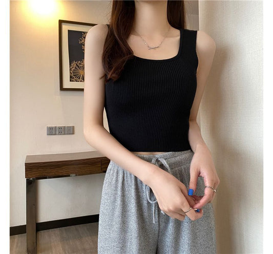 Square Tank Neck Top Ribbed Plain Crop Knit