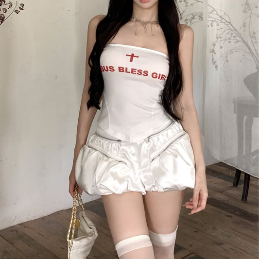 One-Shoulder Plain Crop Tank Top / High Waist Asymmetrical Mini Pencil Skirt