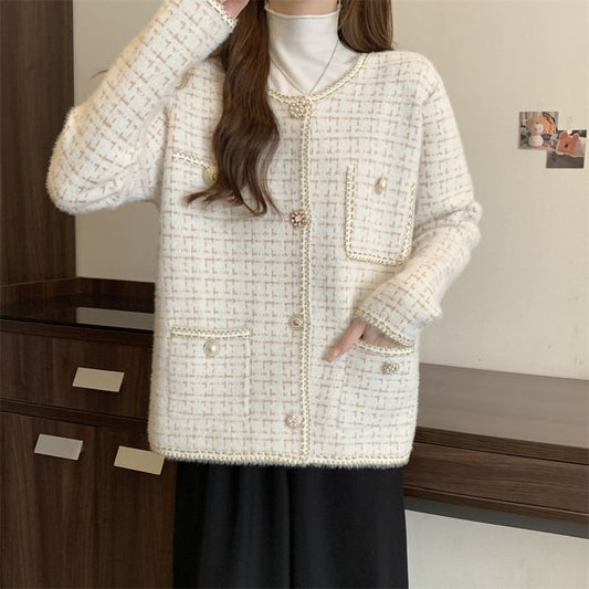 Crew Neck Houndstooth Tweed Double Breasted Cropped Jacket