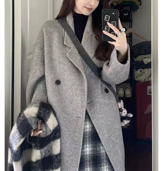 Long Sleeve Lapel Double-Breasted Belted Woolen Blend Coat