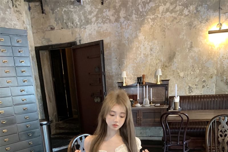 Off-Shoulder Plain Ruffled Shirred Blouse / High Rise Mini A-Line Skirt