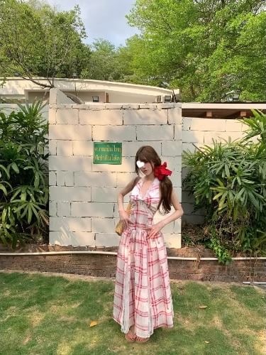 Back Lace A-Line Dress Plaid Halter Midi Panel Open