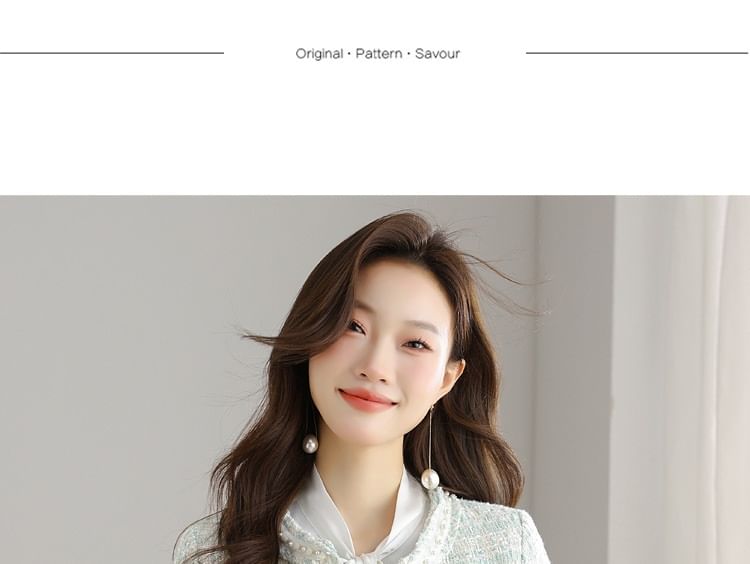 Crew Neck Faux Pearl Accent Open Front Tweed Crop Jacket