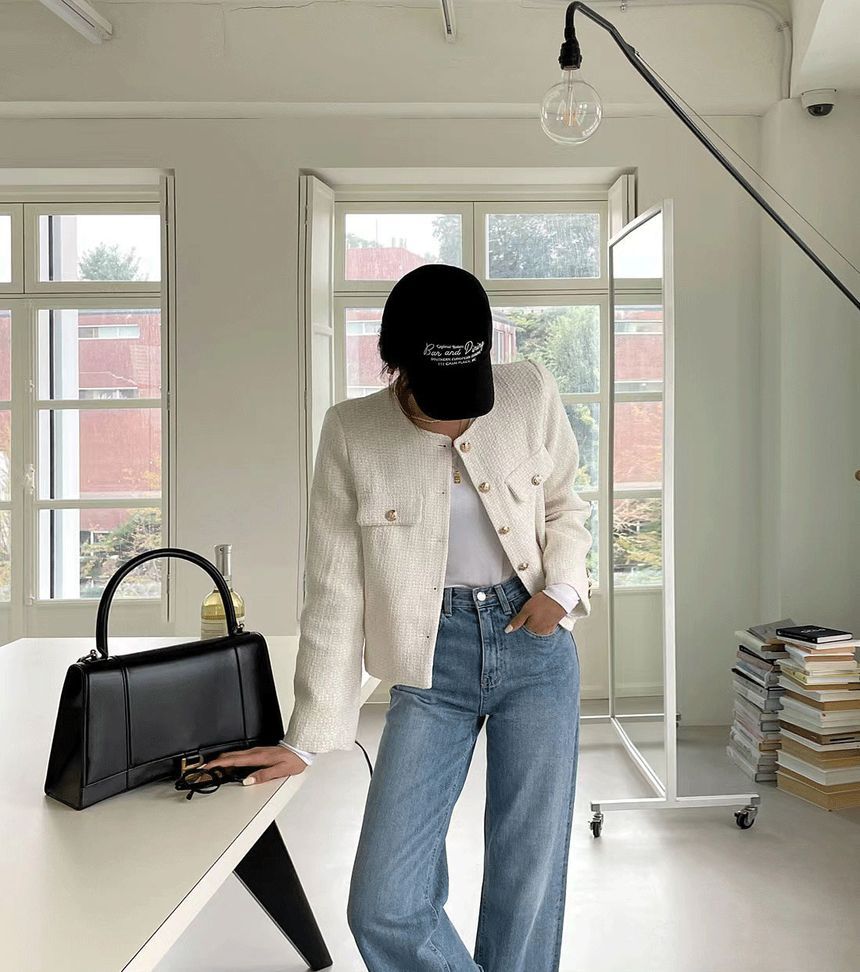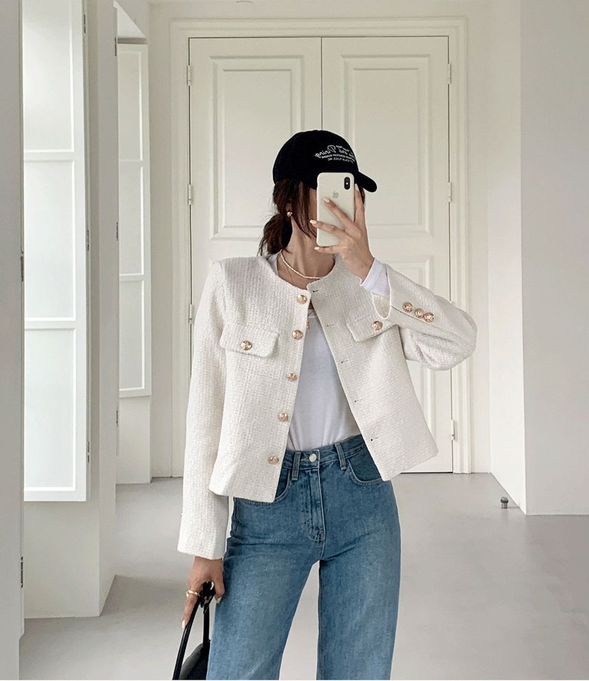 Crew Neck Plain Tweed Button-Up Jacket
