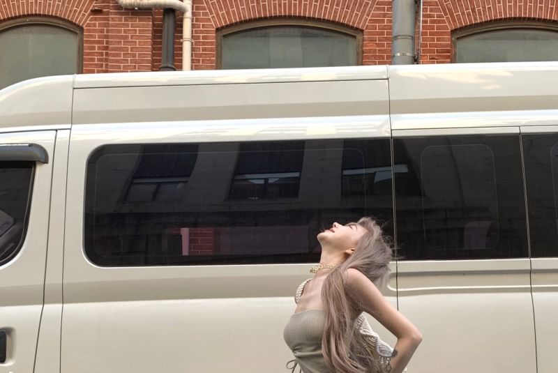 Strapless Plain Drawstring Side-Slit Asymmetrical Top / High Waist Flared Pants