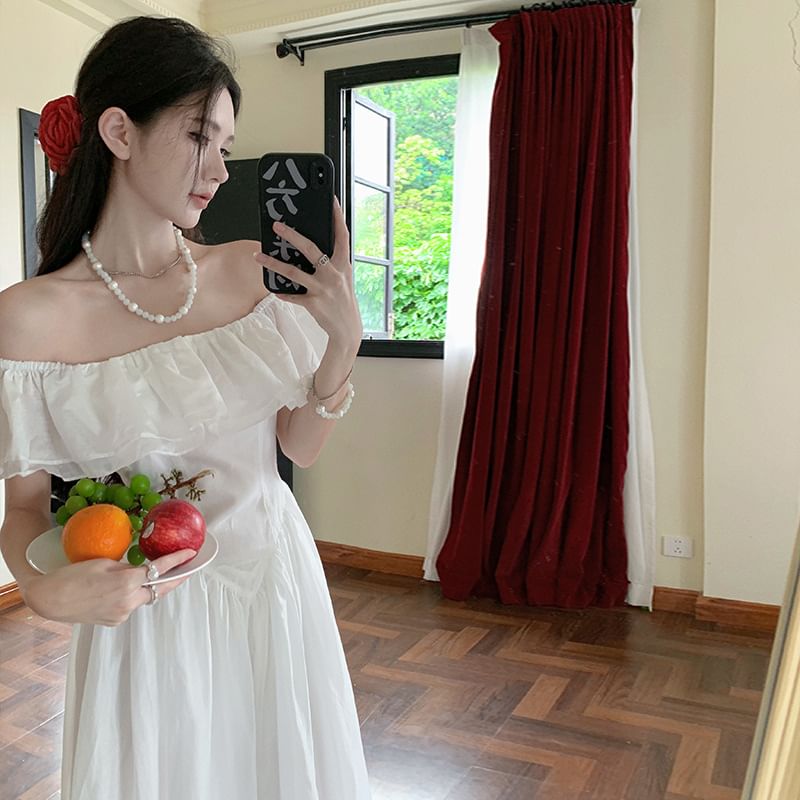 Short-Sleeve Off-Shoulder Plain Ruffle Trim Ruched Maxi A-Line Dress