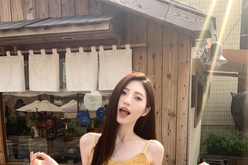 Spaghetti Strap Plain Embroidered Eyelet Mini A-Line Dress