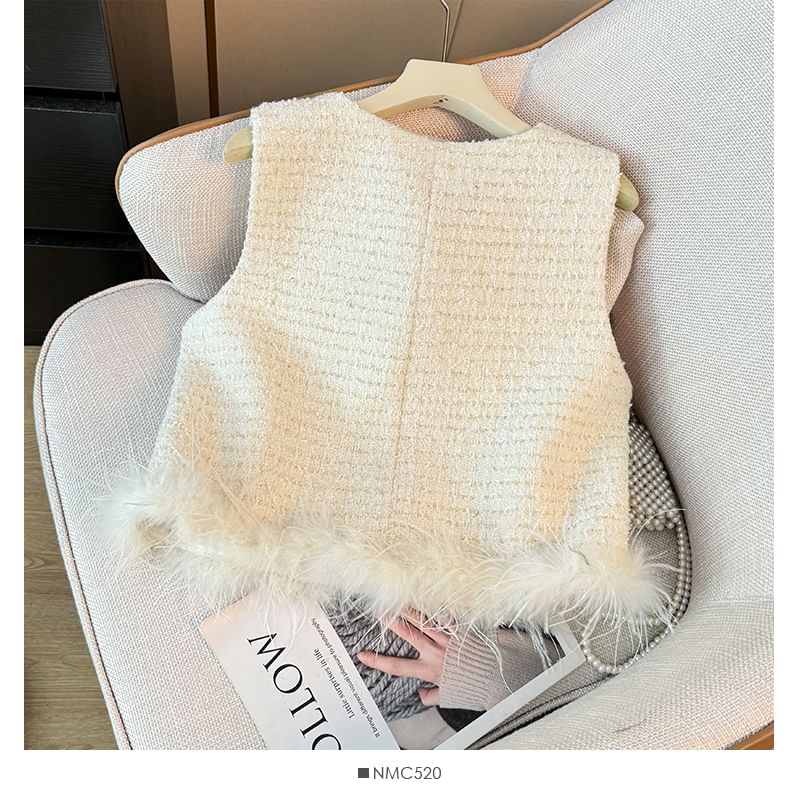 Feather-Hem Button-Up Tweed Vest