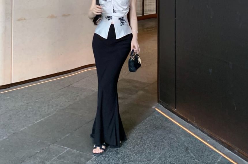 Floral High Plain Cami V-Neck Rise Slit Top Skirt Maxi Pencil / Print