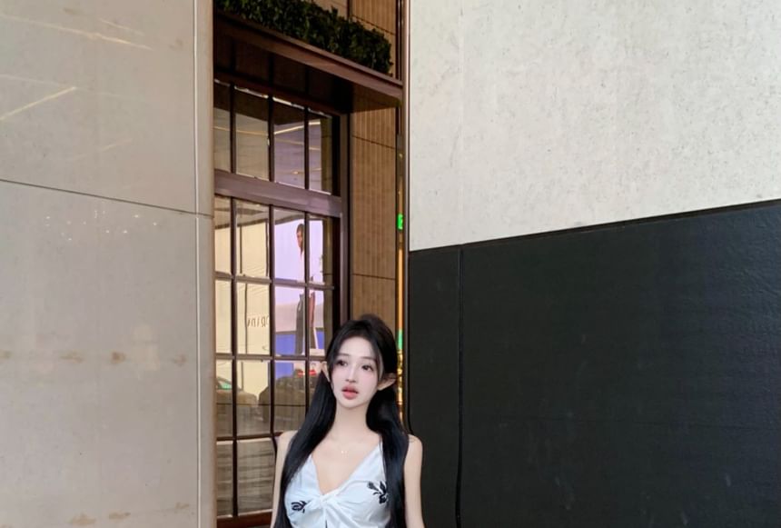 V-Neck Floral Print Slit Cami Top / High Rise Plain Maxi Pencil Skirt