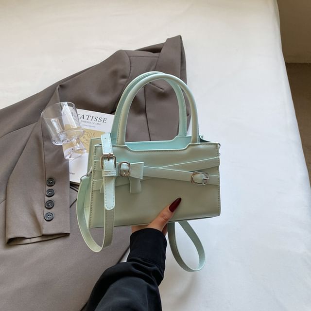 Faux Leather Top Handle Bow Buckled Crossbody Bag