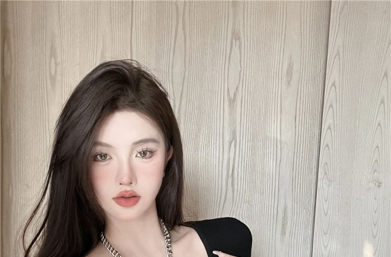 Long-Sleeve Halter Neck Off-Shoulder Plain Asymmetrical Slim Fit Tee