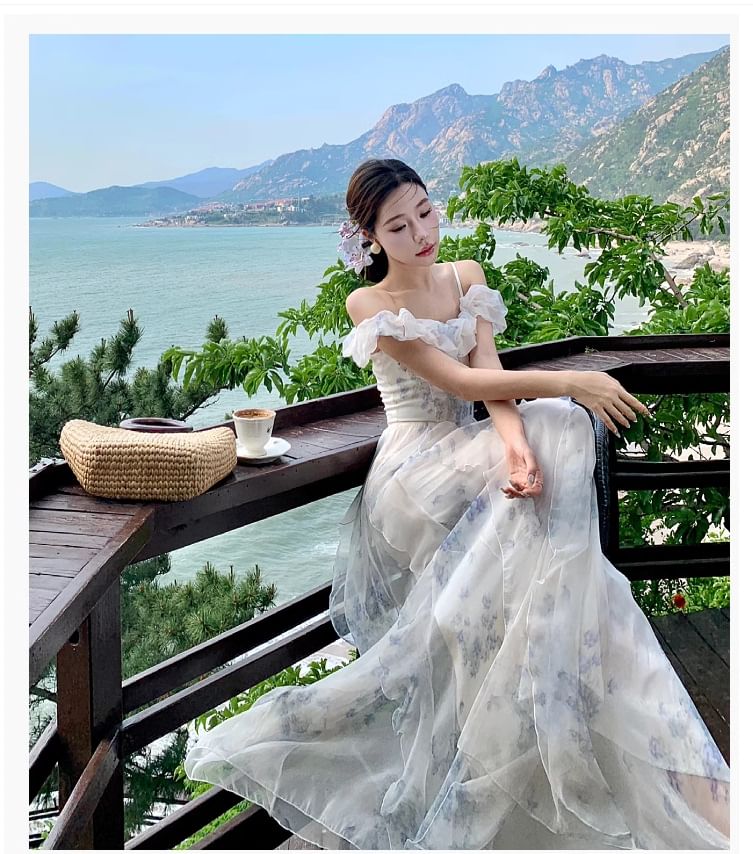 Maxi A-Line Square Cold Print Floral Ruffle Shoulder Ruched Dress Neck Trim